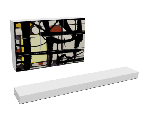 Basi ed elementi pensili in laccato opaco bianco candido con applicazione della Cover G101 nella versione a 9 ante H2HH33