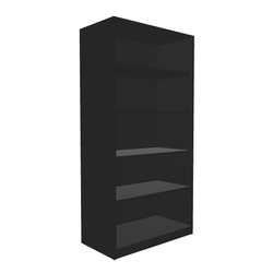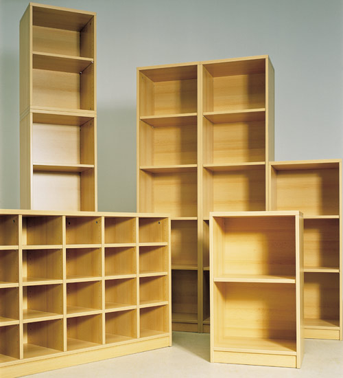 Seitenteile (19 mm) bodenstehend mit Rasterbohrungen, Schrankdeckel (19 mm) aufliegend, Rückwand (8 mm) ringsum eingenutet, Sockel (19 mm) eingenutet und verdübelt