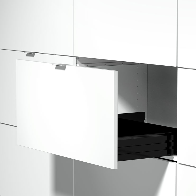 Puzzle ist ein modulares Baukastensystem mit aufschlagenden Fronten. Front- und Rückseite unterscheiden sich in der Ansicht nicht, dadurch können die Module wechselseitig montiert werden. Die einzelnen Module sind mit Einschub- und Sekretärsklappe sowie Hängekorb- und A6 Auszügen individuell bestückbar.