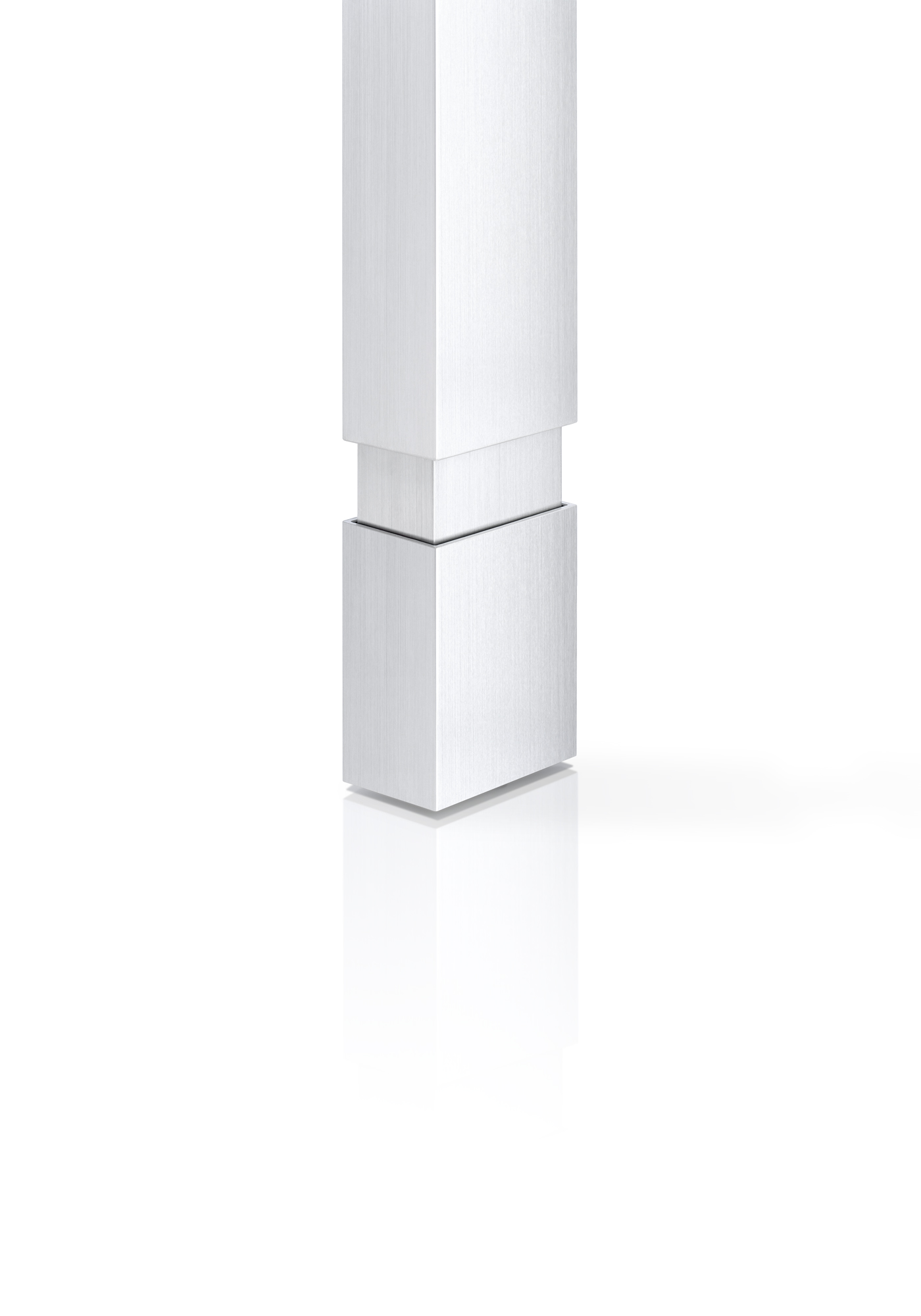 Zwei L-förmige Aluminiumprofile sorgen für die Verbindung zwischen Tischrahmen und Tischbeinen. Die Arbeitshöhe lässt sich von 680 bis 820 mm in 20 mm Schritten einstellen.